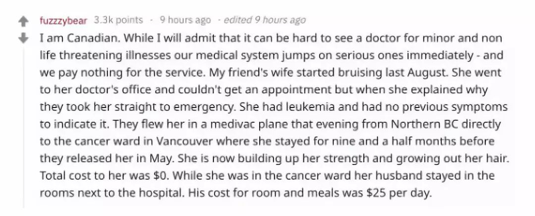 自从川普上台之后, 攻击加拿大似乎成了他的爱好之一 破口大骂加拿大总理特鲁多 简直就成了常态。 比如他炮轰特鲁多: 软弱、不诚实、背后捅刀; 动不动就威胁: 要对加拿大的奶制品、汽车加税,你们就等着吧! 现在,又开始嘲笑加拿大的公费医疗了! “加拿大的社会主义医疗是没用的, 不过,如果你不介意等五个星期才能见到医生, 它还算不错”。 在上周六肯塔基的一次集会中, 川普又充满优越感地表示: 菲莎研究中心(fraser institute)的一项统计显示, 2016年出境接受治疗的加拿大人占1.4%, 其中最主要的原因就是 在本国接受治疗等待时间太长。 “嗯,加拿大人来我们这, 就是因为他们想用美国医生”。 这已经不是他第一次嘲笑加拿大的公费医疗体系了, 早在竞选总统时, 川普就曾把这个话题 当成攻击希拉里的弹药。 他抨击希拉里会把美国推向加拿大式的 低效医疗制度, 称加拿大的公费医疗系统从许多方面来说, 都是非常失败的医疗系统, 是“缓慢”(slow)和“灾难性的”(catastrophic)! 不过,说到网友们的反应, 当然还是一如既往地不买他的账~ 在reddit论坛上, 不少加拿大人都表示受不了川普。 要知道加拿大就医等待时间相对虽然很长, 可遇到紧急情况时, 医院还是会立刻处理的。 这位网友就举例说, 自己朋友的妻子忽然有淤青的症状, 去镇上的医院一查可能是白血病, 结果医院立即用急救飞机 把她送到温哥华大医院, 一点儿都没耽误立刻就诊, 九个半月以后她康复出院, 整个过程一分钱没花。 重点来了, 川普看好了! 一分钱没花啊! 对比一下在贵国看病到底有多贵呢? 看看美国网友们的吐槽吧: 这位网友说: 自己一哥们儿被毒驾司机撞伤 住了一个月的院, 这是最后的账单。($731929.38) 73万多美元, 这得卖房了吧。 在美国, 接近一万五美刀能买多少药? 看看吧, 就是照片上的这么一点…… 朋友的儿子吞了个硬币, 去医院花了5分钟取出来了。 这里是账单。($17159.75) 留学生们也被美帝的高价医疗戳中泪点: “我在美国根本‘不敢’生病。” “我要回国再看医生!”…… “求你千万别叫救护车!我只是晕一会儿而已……” 去年底, 美国和加拿大网友在reddit论坛上 晒生娃账单的事儿曾经火遍世界 当时一位美国网友 晒出了亲戚家孩子的出生账单 并对此表示震惊。 他说自己从来没见过这么高的账单, 生个娃要花61万多美金, 换算成人民币400多万, 这娃还真是金贵啊! 这边厢, 一位加拿大网友忍不住也晒起了加拿大的医院账单: “hi,我来给大家展示一下我女儿出生后的账单” see?不存在的! 这个神贴一出,立刻引爆网络, 很多平日里超级nice的加拿大人 这时也难免膨胀起来, 纷纷晒出了自己(并不存在的)医疗账单 你生娃要花61万?看我的,不存在的~ 我家的,zero~ 你要看我的医疗账单? 一张白纸就是这么简单~ 还有的网友更狠, 直接告诉隔壁的美国朋友: 我们不光生孩子免费, 生完每个月还能领一笔牛奶金呢…… 所以,我们生娃收到的不是账单, 而是支票! 这简直是神补刀啊, 隔着屏幕仿佛都能听到美国人民的心碎的声音…… 还有的网友直接拿数据说话: “加拿大人平均寿命81岁, 美国人平均寿命78岁”…… 另一位加拿大网友用《美国公共卫生杂志》 的调查数据回击川普: “至少我们国家没有像美国那样, 因为缺乏医疗, 一年死掉45000人”…… 当然,也有部分网友表示: “别忘了羊毛出在羊身上, 你怎么不看看自己的税单呢”, “加拿大医疗的确不要钱, 但有时候要命啊!” 不过这一次, 真的感觉川普被啪啪啪打脸, 场面可是非常尴尬了…… 文章来源:温哥华港湾 如涉及侵权请联系我们删除 想要咨询更多关于换汇,投资,私人银行等信息,欢迎联系我们。 中国免费直播号:950-405-98572 |