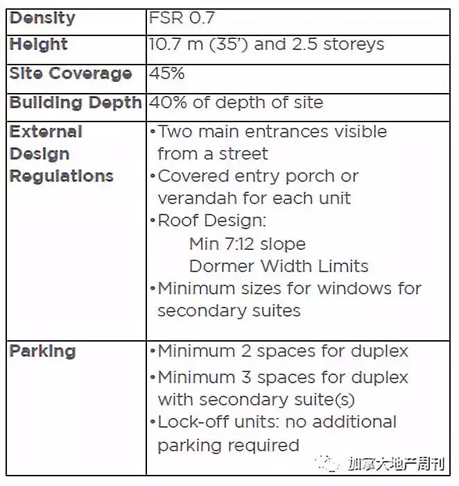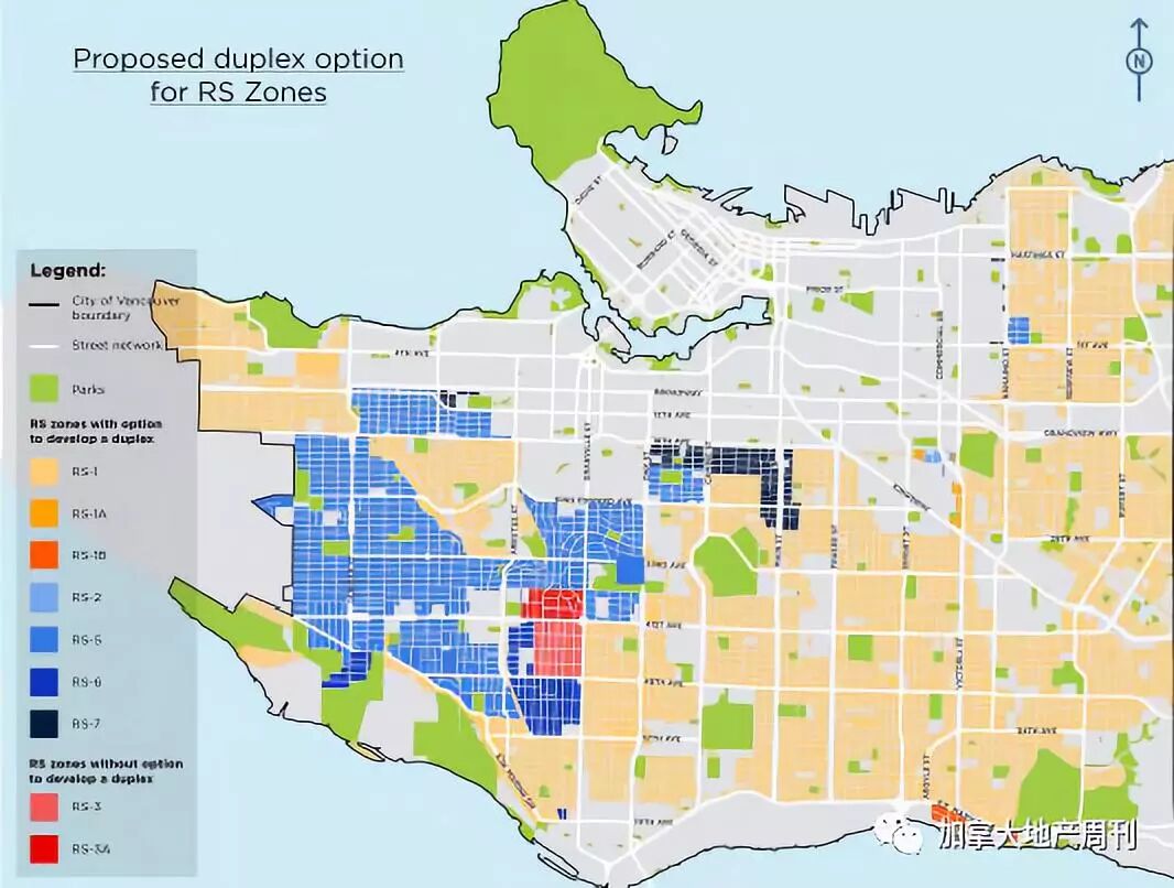 今年9月,温哥华市议会通过决议,将在“制造空间房屋计划”(Making Room Housing Program)的计划下,放松对RS单户家庭(One-family)的分区限制,允许在原来独立屋规划的区域中兴建双拼屋。 这种改变将对温哥华未来的城市面貌和地产市场带来深远的影响。 让更多的人有房可住 市政府施行这一计划的想法很简单,因为温哥华市现在仍有将近57%的土地被规划为单户住宅(RS区划),中密度住宅严重不足,严重影响了房屋供应的数量。这些中密度住宅包括双拼(duplex)、三拼屋(triplex),城市屋(townhouse),平房小区以及低密度公寓等。如果更改分区开发高密度房屋,势必严重影响社区的景观,带来一系列问题。 温哥华市政府认为,允许独立屋修建双拼屋,可以迅速增加住房供应量,其原因是不需要改变原来的RS区划,社区面貌也不会发生较大改变。 温哥华RS区划示意图 修建双拼屋的要求 为了提高住房供应量以及保护住户的利益,温哥华市政府对兴建双拼屋做出了众多限制: 对于面积在3595呎至5500呎的地块,修建双拼屋时不要求新屋有第二套间(Secondary suites)或者套内分租单位(lock-off units)