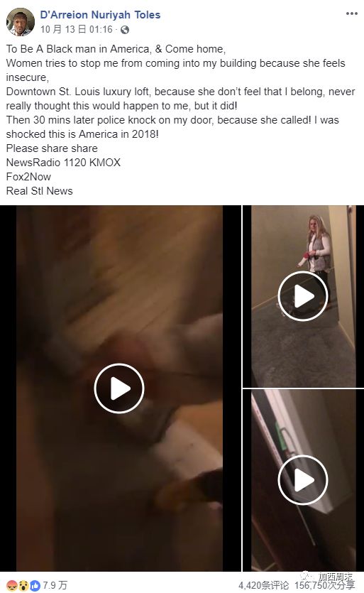这位女子大概是有两副面孔。 华人在国外经常会遭到种族歧视者的不友好对待,同为有色人种的黑人境况则更加糟糕。一般来说,事发后歧视者都不会受到惩罚,这也使得他们越发猖狂。 然而近日,有个受歧视的黑人小哥在社交网络发布了自己的遭遇后,剧情竟疯狂的反转了,让很多人大呼过瘾! 视频的一开始,就是镜头背后的黑人小哥D'Arreion Toles和一位白人女子Hilary Brooke Thornton对峙的画面。从对话中可以听出来,两人正在为黑人小哥是不是住在这栋大楼而争论。 事发的这所公寓是美国的密苏里州豪华街区的Elder Shirt Lofts,小哥表示,自己像往常一样下班回家,用门禁卡打开了门。然而白人女子坚持认为,对方是在自己打开门去遛狗时,想要混入大楼,并对此感到非常不安全。 她不断的重复要求小哥出示门禁卡,证实他住在这栋楼里,并说出他家的门牌号。 显然,黑人小哥感觉到这是女子看到自己的肤色后的歧视行为,而且对方也不是安保人员,自己有权保护隐私,便只说了自己住在4楼,其余问题拒绝回答,并要求女子不要堵着门。在沟通的过程中,黑人小哥一直保持礼貌的说着“please”,“Excuse me”。 但女子仍然不肯放行,认为男子不该就这样进入“自己”的公寓楼。两人在门口僵持了近2分钟时,小哥终于忍无可忍的推开女子,从门口挤了进去。 进入大堂后,女子一直跟随着男子 女子显然非常生气,但碍于镜头,除了说了一句“Are you kidding me?”以外,似乎也不好做什么。 随后,女子并没有放弃纠缠,不去遛狗也要坚持跟着小哥并一起上了电梯。在电梯里仍然不断重复着一些不相信小哥是住户的话,还说明自己并没有“不尊重”和“无礼”的行为。 电梯到达了女子所住的3层后,她并没有下电梯,而是要跟着小哥去看看他到底住在哪。但这个时候,她明显开始有些心虚的为自己解释道:她只是想确认一下对方为什么在这里,到底是朋友还是另外的原因,如果是住户的话,她会为新认识一个邻居而感到开心。 但小哥显然不想再和她纠缠下去,边录像边急步走回家。 女子则一路跟随到了小哥的家门口,当她看到小哥打开了家门,要是还挂在门上的时候,女子话锋一转说道:我只是想跟你问个好(Say Hi)。 小哥当然不想和这样的人做朋友,迫不及待的和女子道了晚安,并告诉她不要再做这样的蠢事后,冷冷的关上了门。 事已至此,已经没有理由再认为黑人小哥不是这栋高档公寓住户了,但随后警察的到来让小哥更无奈,因为女子在离开后还是打电话报警了。 当然警察并没有对小哥进行深入的调查。但事后(10月13日)他将3个短视频发布在了Facebook: 小哥表示,作为一位美国黑人,回家竟也成了一件难事。这位女士阻止我进入大楼只是因为我让她感到不安全,因为她认为我不是圣路易斯市中心豪华公寓的住户,甚至打电话报了警……从来没想过这样的事情会发生在自己身上,我对2018年这样的美国感到震惊! 视频发出后,立刻引起了民愤,很多人在表示对小哥的理解和同情的时候,也抨击了女子的厚颜无耻。 然而最吸引眼球的,则是小哥Facebook主页的个人介绍,工作信息一栏显示他是一家财富咨询公司的老板。 试想,如果白人女子先看到了小哥的简历,是否还会认为他住不起豪华公寓呢?是否会完全换一副面孔呢? 至于同样住在这栋高档公寓里的白人女子 Thornton,后来被KMOV新闻证实她2009年毕业于俄亥俄州的迈阿密大学,职业是一名Tribeca Luxury Apartments公司的房产经纪。 但谁成想,这家奢华地产公司也是一家少数族裔经营的企业,老板在了解了事件之后,不但表达了他们不支持种族主义的意见,还直接把女子解雇了!想必这个惩罚对她来说也是相当难忘了,也希望她可以以此作为警戒,在考虑个人安全的同时,也可以尊重他人。 最后,黑人小哥通过KMOV表达了自己对广大网友的感谢之情,但他并不会对此事采取法律行动,也希望大家不要再打扰Thornton。他很庆幸自己记录下了事件的过程,否则自己很可能会有一个完全不同的遭遇。 “我会和她谈谈,也希望她一切都好。”小哥说道。 文章来源:加西周末 如涉及侵权请联系我们删除 想要咨询更多关于换汇,投资,私人银行等信息,欢迎联系我们。 中国免费直播号:950-405-98572 |