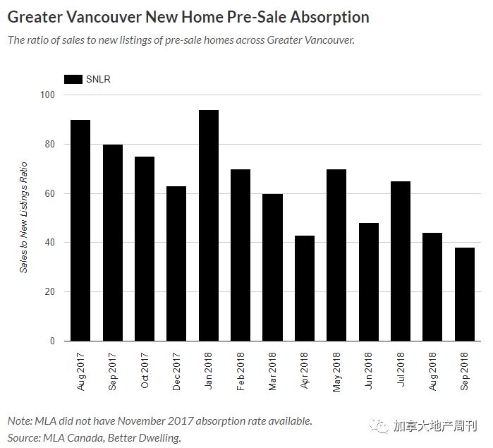与8月相比,9月份不仅楼花的上市量大大下降,吸收量也仅有38%,下降了13.63%。与去年同期相比,这一数字更是暴跌超过一半(52.5%)。因此,9月也成为大温多年来吸收率最低的一个月。