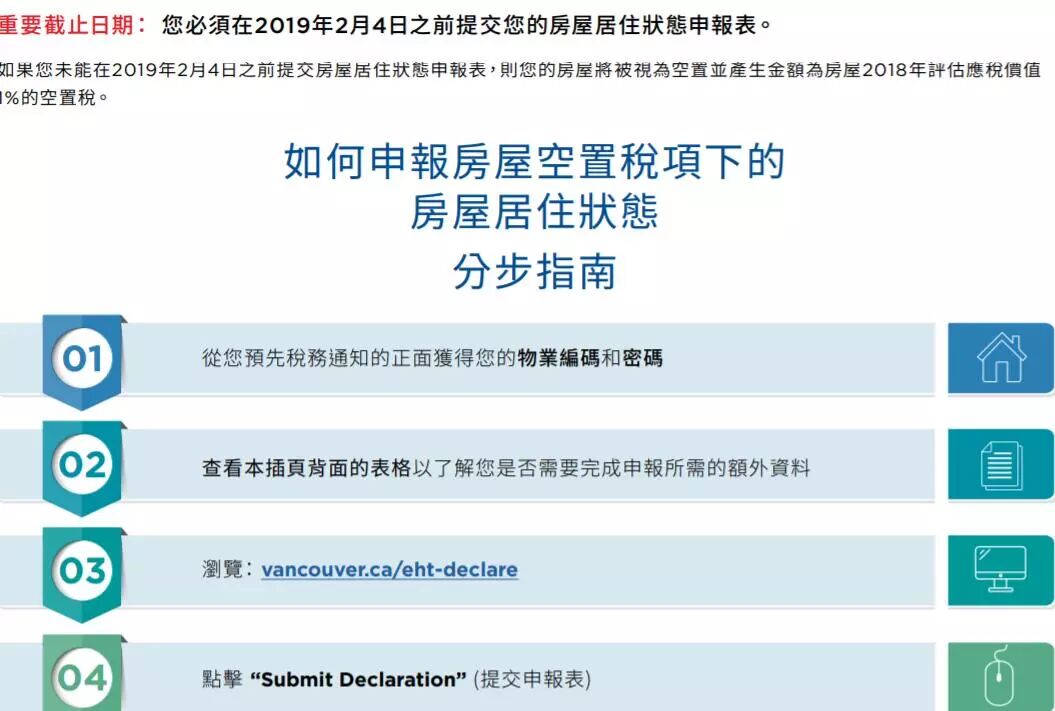 注意事项: · 每一个BC省屋主都需要申报投机税,千万不要误以为您只有唯一的自住房就不需申报此税。屋主需结合BC省政府发布的问卷以及以下提到的相关豁免条款,申报居住情况,从而判断是否有减免资格。 · BC省的投机税不同于温哥华市政府的空屋税,也就是说如果您的房子在温哥华市,交了空屋税,您还需要申报缴纳BC省的投机税。 温哥华市空屋税 温哥华市政府在1月8日星期二提醒住宅业主,申报物业是否空置的期限至2月4日届满,至1月7日,已有94,685间住宅完成申报,比率约50%。 按规定,住宅业主需每年申报一次物业是否空置,如在网上申报,两分钟可完成程序,网址为vancouver.ca/eht-declare。 如未有在期限前申报,便会以空置物业处理,按2018年的物业估价征收1%空置税,另加$250元罚款,并需于2019年4月12日或前缴交,否则再加收5%罚款。 如何申报 唯有死亡与交税无法避免,再麻烦也得耐着性子申报。 01▶ 温哥华 申报步骤和填报表格在这,市政府贴心的准备了中文表格。官网上的入口,是要用你收到的这封信进入的。 总之就是直接填报,直接提交。 要减免的就要材料齐全。温哥华市区的空置税,要免税,2018年出租至少6个月,每个租期不少于30天,,租客得在租赁协议上有全名。 如果是家人住在房子里,家人朋友也需要验明正身。房主自己在外地工作的,要雇主信息。要是外出接受医疗的,要有医疗机构的电话。施工装修的,那要有许可证。 申报之后,办公室会抽取一部份人来抽查,被抽查的人就要被要求提供以上文件。 02▶ BC省 BC省的投机与空置税的指示页面,远没有温哥华市的贴心,可能省政府这税出台得太快,还没准备好。也可能BC的华人业主不够多。 总之,BC省的屋主都会在二月中旬之前收到有识别号码的信,这封信用于申报,估计BC省会照抄温哥华市的宝贵经验,所以格式就在第一部分。 如果没有收到信,千万不要认为自己不在应税区域,不该交。打电话催! 因为BC省政府和温哥华市政府一样早说了,不申报就是空置,不申报就交,按照最高的交。 网上申报的入口,一月底才能开放,也可以电话申报,省政府说,电话是准备好了翻译的。 BC房屋投机和空置税豁免条款: · 主要自住房豁免 – 加拿大公民和永久居民并且是BC省居民的主要自住房,在一般情况下,可享受投机税豁免;上述强调的几类人群,在不享受其他豁免条款的情况下,即使将房子作为自住,也不能豁免投机税。 · 出租房豁免(非关联方出租) – 房屋部分或整体出租给非关联人士(非亲属、非生意合作方、非朋友等),且满足2018年需出租三个月以上,2019年及以后每年需出租六个月以上。出租行为须有正规的房屋租赁合同。此类出租,一般情况下,可享受投机税豁免。 · 出租房豁免(关联方出租)- 屋主是加拿大公民或永久居民,且非空中飞人家庭成员,将房屋出租给关联方(如成年子女,父母等),住户将此房屋作为自己的主要居住房,则在一般情况下可享受投机税豁免。 · 出租房豁免(关联方出租)- 屋主是空中飞人家庭成员、非公民身份、非永久居民身份,将房屋出租给关联方需满足以下条件才能获得投机税豁免: o 租住户必须是加拿大公民或永久居民 o 租住户必须是在自然年度最后一天是BC省的税务居民 o 租住户不能是一个空中飞人家庭的家庭成员 o 租住户的BC省收入年度收入必须是所住房屋整租年度租金(市场价格)的三倍或以上。 · 危险或受损房屋豁免 – 此种情况可以申请豁免,前提是该物业必须在该年内至少60天内不适合居住。 · 医疗豁免 - 业主(或其配偶或子女)因医疗原因需要去专业设施居住,原本自住的房屋可豁免。 · 购买豁免年份 - 在购买该房产的当年,如果购买时支付了房产转让税,则可豁免当年的投机税。如果交易是法律规定的豁免房产转让税的情况,该物业当年也可以免税。因为遗嘱继承而获得的房产,当年也可以免税。 · 配偶分居豁免 - 已婚夫妇或同居婚姻关系至少两年的配偶,如果他们在一个税务年度里分居(由于配偶关系破裂)至少90天,则其主要住所可以免税。 · 破产豁免 - 如果所有者的财产在该年度内至少连续60天归属于受托人,或者在12月31日时归属于破产的受托人,则破产的所有人或受托人可免于投机和空置税。 · 死亡豁免 - 房产所有者在纳税年度内死亡,则该物业所有拥有者都可以在死亡年份和第二年享受免税。 · 未成年人的遗嘱信托豁免 - 如果信托是由已故的父母或孩子的监护人确定的,则投机税不适用于未成年子女的信托财产。 · 有租赁限制的物业的豁免 - 如果分契共管房产在2018年10月16日前有出租限制,则这些房产在2018年和2019年纳税年度免交投机税。 · 分契酒店豁免 - 分契酒店(Strata hotel)的单位可免交2018年和2019年的投机税。 · 持牌日托豁免 - 用作持牌日托的房产免征投机税。 · 空置土地豁免(仅限2018年纳税年度)- 对于不包含住宅房产的土地,2018年的纳税年度不征收投机和空置税。 · 在建房屋豁免 – 若房屋处于在建或大修状态,不适合居住,则在符合条件的情况下可以获得投机税豁免 · 公司、信托、及合伙人豁免 – 需具体情况,具体分析。 税务影响: 税额减免 如果您没有获得豁免,缴纳了投机税,您可能会享受到一些税额减免: 01 · BC省居民屋主 – 二套房屋可享受最高$2,000的税额减免。未使用的减免不能向以后年份递延或者转给配偶使用。 02 · 外国人屋主