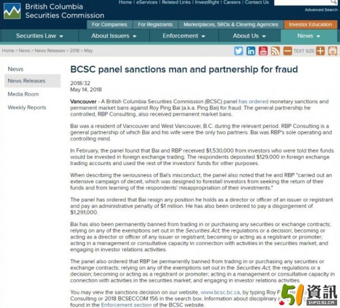 卑诗省证监会(BCSC)近日对卑诗省华裔白平(Ping Bai,译音)夫妇涉嫌利诱投资诈骗案作出判决,除了要求夫妻必须还回129.1万元的不当所得外,还对其行政罚款100万元,使该判决牵涉金额高达229.1万元。