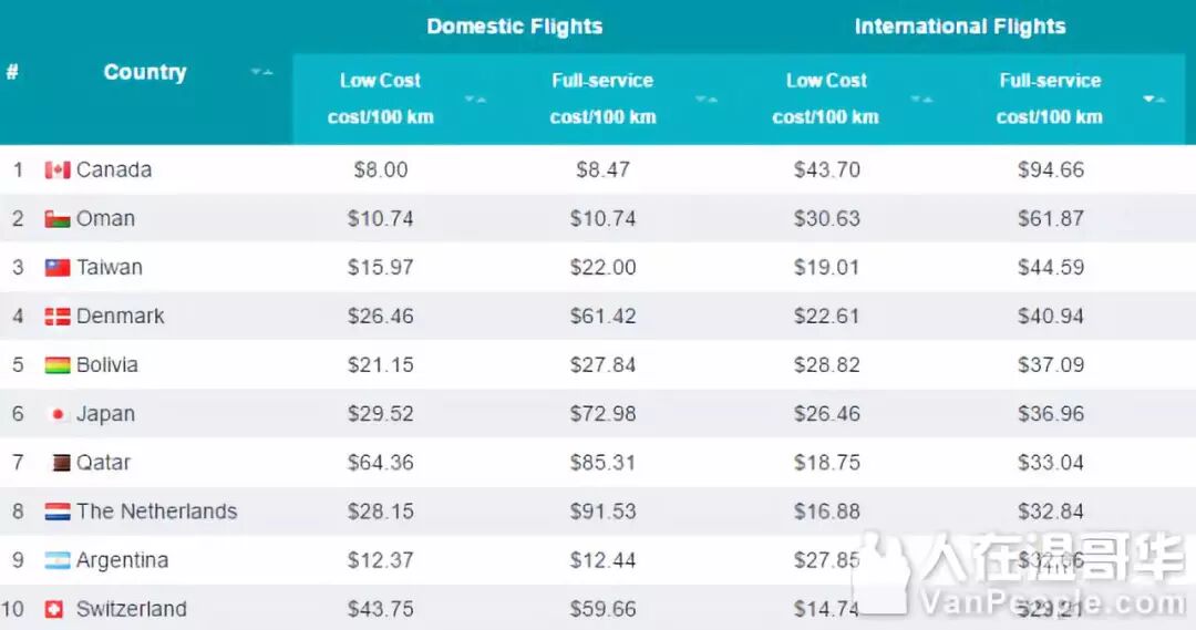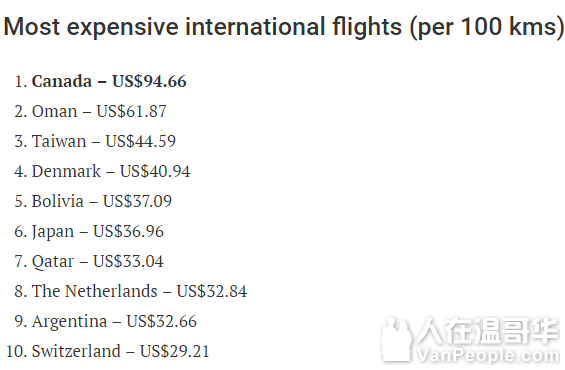 加拿大航空全球最贵。 不查不知道,原来加拿大是世界上机票价格最贵的国家: 全球国际航班价格排行,加拿大位列榜首: