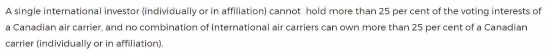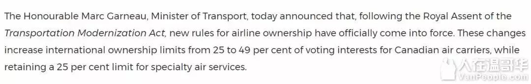 新政优势。 早在2016年,Marc Garneau出席蒙特利尔商会时就已经表明, 加拿大联邦政府有意向对外资采取更宽松的政策, 来增加航空公司间的竞争,鼓励他们开通更多廉价航线,给乘客带来实惠, 例如降低机票价格、提升机组的服务质量、更好地保障旅客的权益等等。 "This can bring down airfares and it can also provide more destinations and more choice for consumers," “(扩大外资投资权限)能够有效降低机票价格, 促使航空公司开通更多航线,给旅客提供更多的选择。”