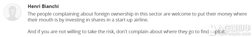 而有人则觉得引进外资不是一件坏事, 尤其是对于那些正处于创业初始阶段的航空公司来说。 那些抱怨引进外资到航空业的人为什么不自己投钱到新起步的航空公司那里去。 既不想承担风险又想拉到资金,哪有那么好的事。