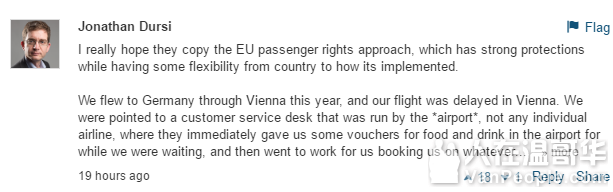 交通部长Marc Garneau在出席商会时向记者表示,新政策除了包括提升外资投资股份之外,还将立法规范航空公司的行为,包括:飞机晚点赔偿(比如如果延误超过5小时,旅客有权获得已购机票的全价退款)、机票超售赔偿和行李丢失赔偿等。 他表示新政会精确到细节,而不是笼统的空话。因为每家航空公司规则都不一样,给乘客维权造成了不小的困难,有了统一的法规之后,乘客们就有据可依了。 除此之外,交通部长还承诺会改进机场的安检设施,减少旅客等待的时间。 网友褒贬不一 对于航空业的新措施,加拿大网友发出了褒贬不一的声音。 部分网友开启了嘲讽技能,指责加拿大政府“卖国”。