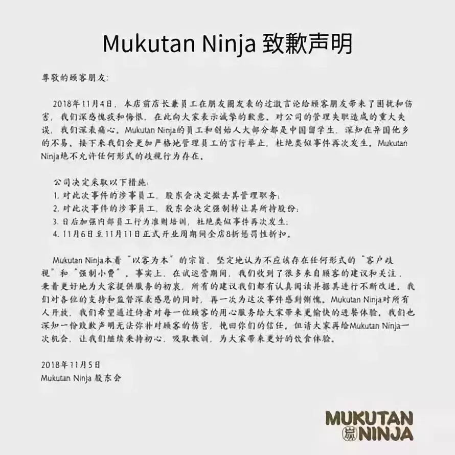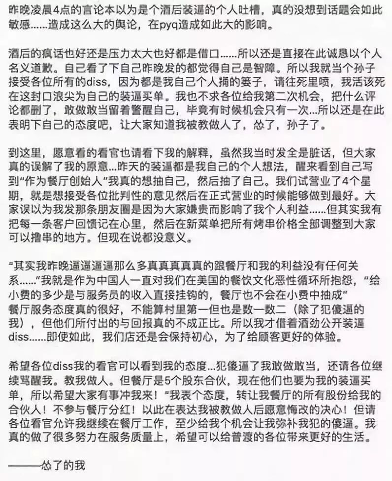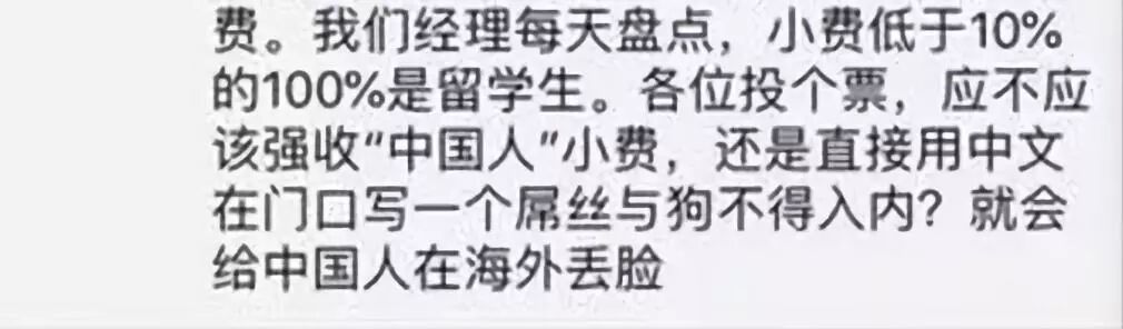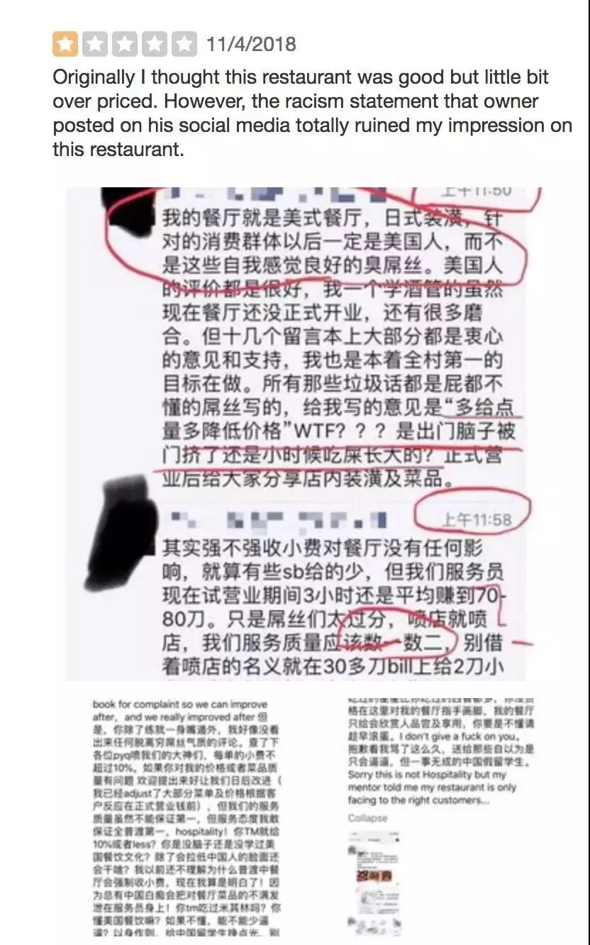食检局表示,餐馆在卫生检查中不达标,只是表示有健康隐患,并不意味着去过那里的顾客就会生病,而检查员对餐馆开出警告单,是为了帮助它们回到正轨。 文章来源:加国无忧 如涉及侵权请联系我们删除 03 很多时候,是出了国才知道,原来这个世界上,最歧视中国人的不是别人,而是我们中国人自己! 独在异乡为异客,每遇同胞必思亲! 无论是生活在海外的华人,还是在异国求学的留学生,看到同样肤色的人总会感到亲切友好,甚至互相照拂。 但就在前几天,几位中国留学生却被一家餐厅老板辱骂,最令人诧异的是:骂中国留学生的老板竟然是也是中国人?! 这事儿说起来还挺绕乎的,一家在美国印第安纳州普渡大学附近的中国人开的日本餐厅,这些日子在网上火的不要不要的~ 不是因为好吃,也不是什么广告,而是这位中国老板竟表示:要用中文在门口写,屌丝与狗,不得入内! 这一下可真是犯了众怒,声讨之声一浪高过一浪,餐厅的Google评论瞬间就被攻陷!Google评分将至1.7分,史无前例之低。 眼见着惹了祸,老板也吓坏了,赶紧认怂道歉,说“我那只是酒后个人吐槽装逼,大家误解了我的原意。” 可当地的中国留学生以及华人网友们可不答应啊,接连警告:“先学会做人再做生意!” 起因:一个朋友圈的差评 这场风波发生在一家位于印第安纳州普渡大学附近的Mukutan Ninja日式餐厅。就是下图这家,装饰装潢确实非常用心。 餐厅走日式居酒屋风格,由几位中国合伙人共同所有,事发当时才刚开业,还属于试营业阶段。讲真,餐厅开业之后,当地中国留学生还是非常捧场的,纷纷三五成群前来品尝。 和大多数年轻人一样,试吃消费后,大家也习惯性的在自己的朋友圈里分享了自己对于新餐厅的感受,其中一位留学生发表了这样的看法: “装修是很不错,真的很不错。毛豆是冷的,烤串也比较凉,takoyaki(章鱼小丸子)味道不是我的菜。special的beef stew是挺好吃的,tonkatsu(炸猪排)加truffle zest(松露粉)蛮搭。” 微信截图 最后,同学给出了一个总结:“总体就是装潢>食物。” 其实在小编看来,这位发朋友圈的同学的评价还是挺中肯的,没毛病!没有任何攻击性言论,也没有恶意误导,而且仅仅是发在自己的朋友圈里,并没有上传到公共的Google评价系统。 可即便如此,这个评论也惹恼了餐厅老板、合伙人中的一位。 这位老板不知道从什么渠道看到了这条朋友圈,随即在自己的朋友圈发了下面这样的内容: 每个字都带有浓浓的火药味啊! 总结一下,咱划下这位餐厅合伙人的观点中的重点: (1) 如果你对餐厅有意见,你可以提,但是不可以在朋友圈里提,只能在反馈单里提! (2) 在朋友圈里评价餐厅的,都是来美国留学的穷屌丝;小费都没给过超过10%,还好意思提意见? (3) 你们这些“屌丝”留学生吃过米其林吗?没见过世面就少逼逼! (4) 我们餐厅针对的客户群体是美国人,而不是你们这些从中国来留学的屌丝; (5) 各位投个票,到底应不应该强收“中国人”小费,还是直接用中文在门口写一个“屌丝与狗不得入内”? 要知道,海外华人圈本来就不大,普渡那个地方的圈子就更小,餐厅老板的言论立即引起很多中国留学生的强烈不满,很多华人直接截图,事件再次升级! 越来越多对餐厅不满的声音涌现出来。 “之前去吃饭的时候,章鱼烧还是冰的,能吃出冰渣……” “兄弟,你这个样子,怕是等不到正式开张哦。” 不仅如此,被激怒的华人朋友们,纷纷跑去Google给这家餐厅留言,他们的Google评分被迅速拉低到1.7! 大家职指责餐厅:“商家不仅态度粗鲁轻慢,还歧视中国留学生”。 “餐厅老板是种族歧视者,他本身是中国人,但他却说中国顾客是屌丝和狗!” 一波又一波的评论,让餐厅评分再创新低——1.5! 餐厅道歉:认怂! 果不其然,在群众的舆论和反抗之后,这家言语嚣张的餐厅合伙人迫于压力,发了一封所谓的“道歉信”: 最后落款“怂了的我”,这名老板表示,那些引起争论的言论,都是酒后装逼的个人吐槽,没想到会如此敏感。他说,“我是孙子,接受大家的批评。” 并表示,“大家误解了我的原意,我昨晚说那么多真的和餐厅,和我的利益没有任何关系....”道歉的最后,这位自己意识到闯了祸的老板公开表示,“转让餐厅的所有股份给合伙人,并希望可以继续在餐厅工作。” 从这封“道歉信”中,我们不难看出,他写这封信只是他对于舆论的妥协和迫于各方压力才“认怂”,而不是真心悔过。 事发后,有当地媒体报道称,老板也试图去和当事人联系道歉,也一直在努力加那位女生的微信,但一直没有验证成功。老板一再表示:“他针对的,是那些完全不给小费的人。”“小费都是给服务员的,这也是心疼服务员。” 在跌破了Google“关门大吉”1.5分水平线后,餐厅也发出了致歉信: 遗憾的是,收效甚微,这样的伤害不是三言两语就能弥补的。 那一句句“我的餐厅只给会欣赏的人品尝及享用,你要是不懂请趁早滚蛋!” “中国留学生屌丝与狗,不得入内!” 听起来,真是刺耳!这些语言,伤害的不仅仅是自己的餐厅,更是千千万万海外华人的心。 我们理解创业的艰辛,但也希望店家能用一视同仁的目光来对待消费者,你始终带着歧视的目光,又怎能提供出高水平的服务? 平心而论,这家餐厅的道歉你会接受吗?这样的餐厅,你会去吗? 文章来源:温哥华港湾 如涉及侵权请联系我们删除 想要咨询更多关于换汇,投资,私人银行等信息,欢迎联系我们。 中国免费直