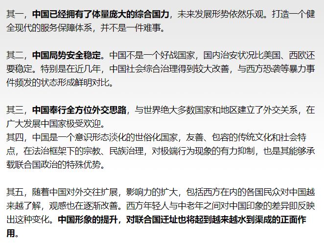虽说这个区域属于国际领土,但是却在美国国土之内。 到联合国参加活动的所有人,都需要经过美国领土。 美国签证就成了一道坎, 多年来,美国不时的挥舞签证大棒, 不让这个到联合国参加活动,不让那个到联合国参加活动。 可以说是非常任性了…… 如果联合国总部继续留在美国,怎么能继续正常开展活动呢? 为了不让美国利用签证手段牵制、控制、约束联合国,剥夺成员国参加联合国活动的权利, 俄杜马(俄罗斯国家议会下院)副主席、“公正俄罗斯党”主席列维切夫认为, 联合国改革问题或可从将关键部门迁至新的全球经济增长国着手。 “国际维和组织迁往这些国家将是合乎逻辑和公正的”。 ----我是广告 点击查看大图---- 谁说贷款公司都一样? 我们为您的各种梦想融资助力加油! ----广告结束 谢谢您的关注---- 他说,今年联合国成立周年纪念,外交界多次讨论该组织是否履行使命的问题,而当前联合国的许多决议由于该组织总部坐落的位置而被政治化。 这实际上是在说,美国挟持了联合国。 对于这种情况,只有两个选择,要么美国改变利用签证绑架联合国的做法,要么联合国总部迁出美国。 可是美国这个任性的小妖精怎么会轻易改变自己做法呢? 不变本加厉就不错了…… 那么联合国迁出美国似乎就成为了更妥当的选择。 联合国总部迁中国? 这实际吗? 中国提出“人类命运共同体”理念,越来越多地承担国际责任,涉足国际政治,高举“全球化”的旗帜,被认为不再“韬光养晦”而是侧重有所作为。 不过在目前的国际架构体系里,中国受到相应的外交机制与平台的制约。 相比之下,美国在全球的责任与领导角色正在随着其国力相对下降和内部问题而迅速衰减。 这不仅体现在“冷战”结束后的“单边主义”, 也体现在特朗普执政后的以“美国优先”为名的“孤立主义”。 特朗普新政府与联合国之间的纷争,是观察目前美国外交新政策变化的一个窗口。 美国已经退出联合国教科文组织,特朗普在联合国发表讲话时猛批联合国现状,提出大力削减提供给联合国的会费。 其在驻以色列使馆迁址问题上的决定,也已引发联合国和国际范围内的强烈反弹。 在美国国内和其他国家一直有要求美国退出联合国或联合国总部搬离美国的呼声。 俄罗斯国家杜马副主席、“公正俄罗斯党”主席列维切夫在2015年就曾指责美国挟持了联合国,并提议将联合国总部从纽约迁往中国或巴西。 就这样 中国成为了最有竞争力的迁入国! 其优势主要体现在五个方面: 说到这里小编还是想感叹一下: 威武了,我的大中国! 国际社会上发生如此豪迈愿景,直接感觉到20国集团领导人会议在我国杭州举行,那真是豪华阵容,大腕聚首,魁首云集,顶级峰会,空前盛会,神州生辉啊,遂联合国总部或迁址落户中国的愿景让所有参会人员油然而生,且理由多多,顺理成章: 与喜欢热闹喜欢参与世界事务慷慨豪放大方要面子的中国性格非常契合, 比如中国非常喜欢承办各种国际会议和体育赛事, 如果联合国总部迁往中国, 中国朝野上下一定欢欣鼓舞,为之自豪和骄傲, 认为这是体现中国在世界上地位的“标志性‘地标’”; 联合国总部迁址落户中国,世界许多重要会议便会在中国召开,各国领导人会频繁奔走于中国,中国无疑会成为全球瞩目的“世界中心”; 联合国总部在纽约,也成为美国影响乃至干涉和左右联合国决策的重要因素;如果联合国总部迁址落户中国,我们中国何尝不可以影响联合国决策,这显然对中国有利。 那么未来未来可能会迁址哪个城市? 历史性的答案是:西安! 说到西安,她是一部波澜壮阔的史诗,她是一副华夏瑰丽的历史画卷,让人迷醉; 身处每一处遗迹中,你可以跨越时空,你可以感受到强秦的“血不流干,死不旋踵”、聆听大汉的呐喊“犯我强汉者,虽远必诛”、还有盛唐那万国来朝的磅礴大气; 西安的历史,就是一部浓缩的中国历史,长安!长安!! 西安,本来就是世界的中心! 中国发展的趋势是,在现在这个时期重视西部大开发,发展西部。 自周伊始,从秦代到唐代,仿佛很长的时间里,西安都是全部王朝的中心地点。 西安,这个现代兵家必争之地,是贯串全部中国史书的宝地! 中国能够成为联合国迁往国的重要候选之一, 确实值得我们为之骄傲, 但也有一些反对的声音出现, 有人觉得我们尚不可沾沾自喜大吹大擂, 也有人觉得联合国迁到中国西安未必是件好事,不如把联合国扔到戈壁滩去吧…… 上面虽然是玩笑话,但迁联合国总部确实是件大事, 还需要慎重考虑。 中国近年来的发展,大家都看在眼里,喜在心里; 但就此心满意足,固步自封也不是我大中华的风格! 继续努力, 加油!中国 加油!西安 加油!每一个中国人! 信息来源:21世纪新思维 如涉及侵权请联系我们删除 想要咨询更多关于换汇,投资,私人银行等信息,欢迎联系我们。 中国免费直播号:950-405-98572 |