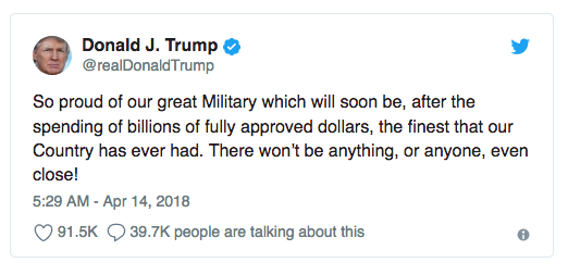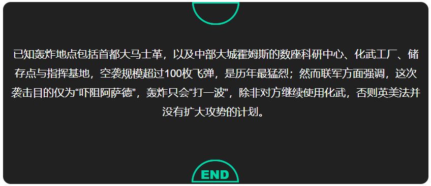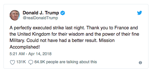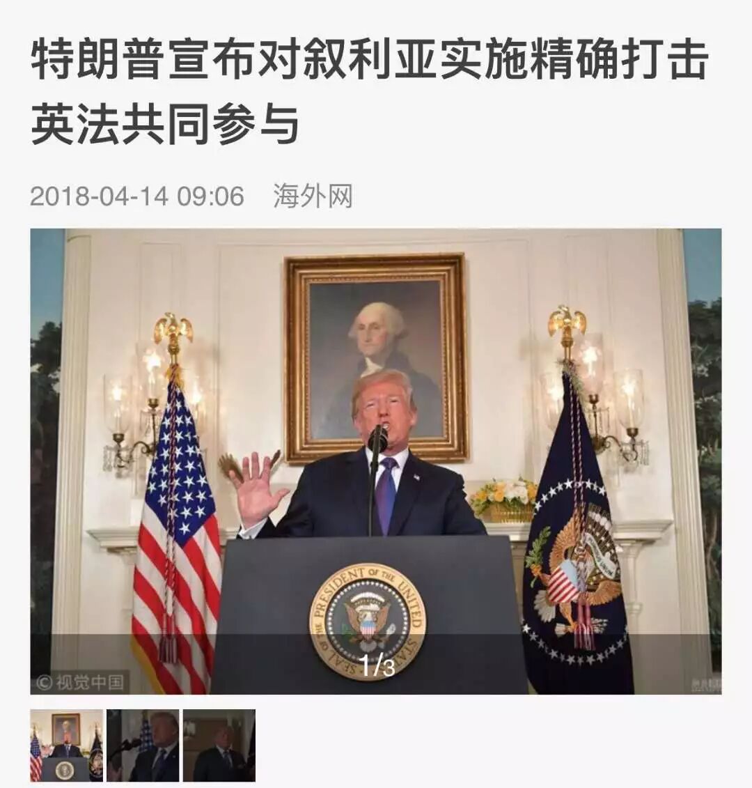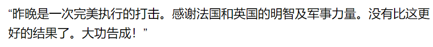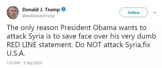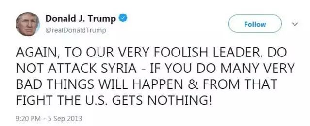 两天前, 美国总统川普上演了一场打脸大戏…… 对叙利亚发动“精准空袭” 不知道他还记不记得, 在2013年的秋天,川普声嘶力竭地呼吁:不要攻打叙利亚! 奥巴马攻击叙利亚的唯一理由,是想为他愚蠢的红线声明挽回面子。不要攻击叙利亚,拯救美国。 再一次,对我们愚蠢的领导说,不要攻击叙利亚。如果你这样做了,很多坏事会发生,而美国不能在战争中得到任何东西。 如今,时过境迁。 川普成为美国总统 毫不犹豫地给自己脸上来了一巴掌 叙利亚时间14日清晨4点,在美国总统川普的一声令下,美军、英军、法军同步对叙利亚发动“精准空袭”。 图自叙利亚国家电视台 美东时间13日晚上9点,川普总统透过电视直播,向世界宣告“空袭叙利亚”。 图自CNN 川普表示,在与英国首相梅伊、法国总统马克宏等重要盟邦讨论并交换手中证据后,三国领袖一致认为: 4月7日发生在叙利亚杜马镇、造成70人丧生的化武攻击事件,必定是叙利亚政府军所为。 图自叙利亚国家电视台 美英法三国均认为此举严重违反禁用化武协议, 且对平民造成重大死伤 因此他们一致认同—— “军事回应是西方世界的唯一选择”。 炮轰时间过去近20个小时之后 普开始“庆功”, 在社交媒体上连发两条推文,感谢英、法两国的协助 同时还称“这次的打击完美执行,大功告成”。 然后还赞颂了一下美国的军队: 不知道川普还记不记得自己几年前说的话…… 当年说不要攻打叙利亚的不是你吗? 只能说形势在变 人心更是在变啊! 图自叙利亚国家电视台 虽说川普是对叙利亚发动的攻击, 国际上另外一位大佬再也坐不住 这位大佬就是俄罗斯了。 美国的空袭威胁已经持续了好几天, 阿萨德早就通知军队撤离了基地、机场 据美英法三国所说, 为了避免驻叙俄军和平民,空袭已经非常“克制”。 轰炸过后,只有建筑受损比较严重。 并未对叙利亚军方造成重大损害。 叙利亚、俄国反而宣称: 联军的侵略飞弹,“绝大多数都遭叙国防空系统成功拦截。” 但之后要是叙利亚再传化武攻击,“我们就会继续发动同等级的轰炸——直到他怕到收手为止。”