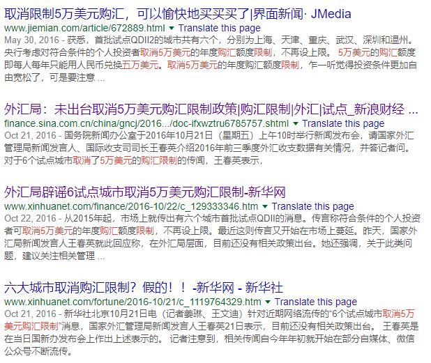 百度搜索“取消5万美元限制”显示出的信息大部分为2016年的谣言,当时国家外汇局新闻发言人王春英第一时间出面辟谣,“在外汇局层面,目前还没有相关政策出台。关于此类问题,建议关注相关管理部门的政府网站,这是可信的、可靠的信息来源”。