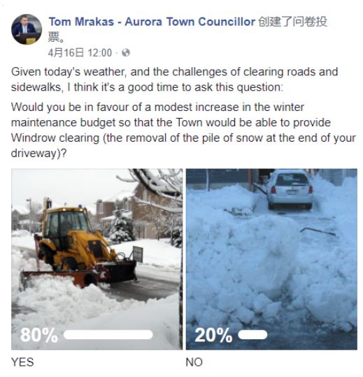 在733名投票者中,有80%表示愿意向市府多交税,用于清除自家车道前的雪坝。20%表示不愿意。